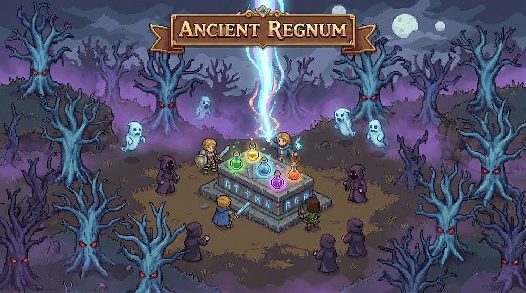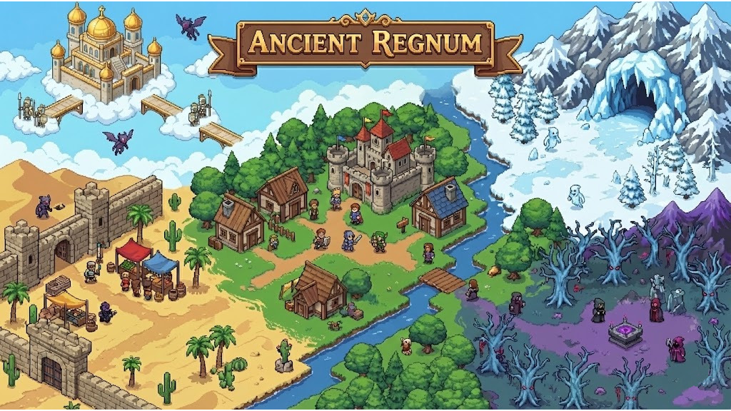 Ancient Regnum é um RPG 2.5D em perspectiva top-down, onde o jogador explora o vasto e místico Reino Ancião, composto por 30 mapas únicos com biomas variados, como florestas, desertos, neve, magma e céus. O jogador pode alternar livremente entre três classes — Guerreiro, Mago e Arqueiro —, cada uma com ataques distintos que permitem estratégias variadas contra inimigos como Esqueletos, Ocultos, Fantasmas do Gelo, Abóboras Explosivas e Death Angels, além de chefes poderosos com mecânicas únicas. O objetivo principal é progredir pelas missões, seguindo uma história envolvente onde os diálogos com NPCs desempenham um papel crucial, culminando na criação de cinco poções místicas — Poção Verde do Condado Real, Poção Amarela do Condado de Khaleek, Poção Azul do Condado da Criofênix, Poção Roxa do Condado de Morsmordre e Poção Laranja do Condado Etéreo —, essenciais para realizar um ritual que permite enfrentar os dragões finais do jogo. Além disso, o jogador pode explorar livremente o Reino Ancião, coletando recursos como madeira, pedra, algodão, minério e couro, e enfrentando desafios opcionais, mas deve ter cuidado, pois inimigos muito mais fortes podem levar à morte.